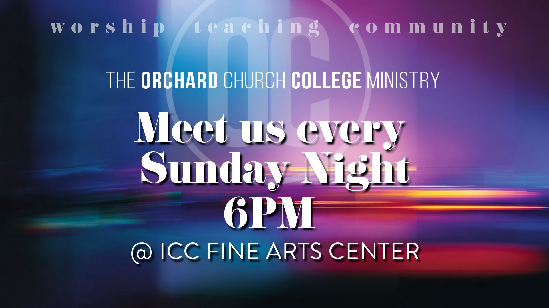 The Orchard Church College Ministry is a weekly gathering for college students who want to grow in faith and find real community. Join us every Sunday night at 6PM at the ICC Fine Arts Center for worship, biblical teaching, and time to connect with other students.
